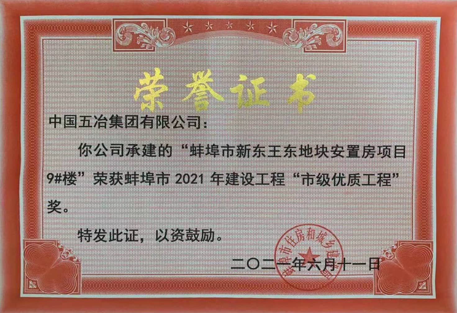 蚌埠市新東王東地塊安置房項目9#樓榮獲蚌埠市2021年建設工程“市級優(yōu)質工程”獎