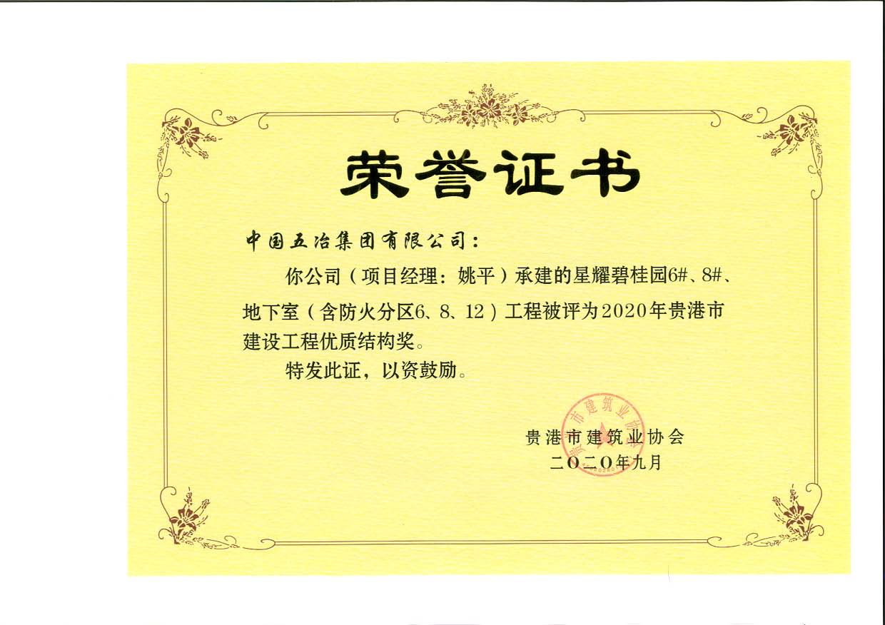 星耀碧桂園6#、8#、地下室工程—2020年貴港市建設工程優質結構獎