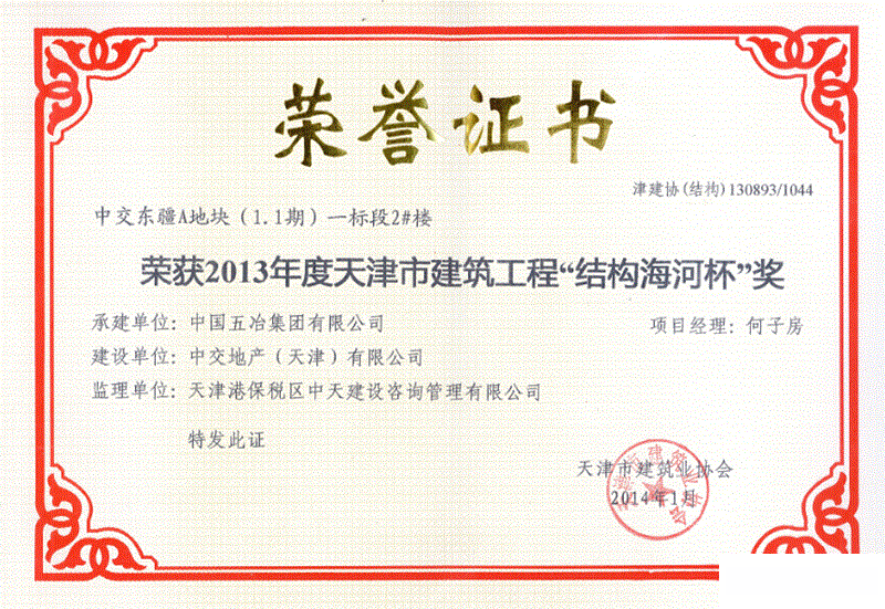 中交東疆A地塊(1. 1期)一標(biāo)段40#樓--2013年度天津市建筑工程“結(jié)構(gòu)海河懷"獎(jiǎng)