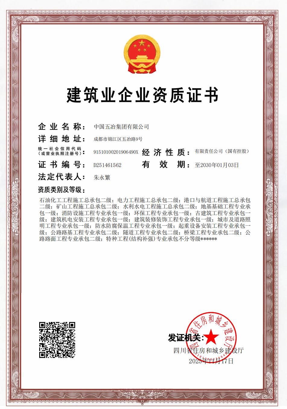 建筑業企業資質證書(建筑、市政、公路、冶金特級)