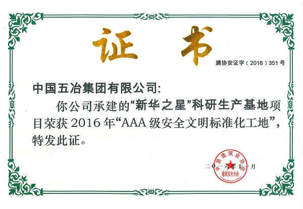 ? ?2016年12月,中國五冶集團新華之星”科研生產基地工程項目和國貿金融中心工程項目榮獲2016年全國“AAA級安全文明標準化工地”稱號。