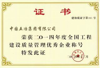 ??2015年2月,中國五冶集團有限公司榮獲2014年度全國工程建設質量管理優秀企業稱號。