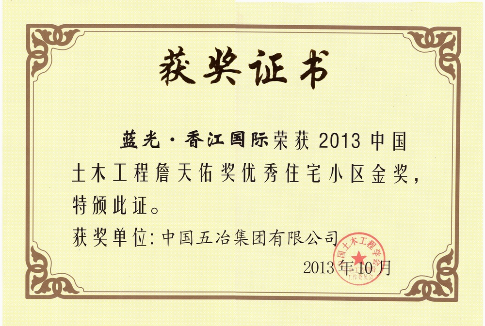 ????2013年10月,中國五冶集團有限公司藍光·香江國際項目榮獲2013年度中國土木工程詹天佑獎優秀住宅小區金獎。