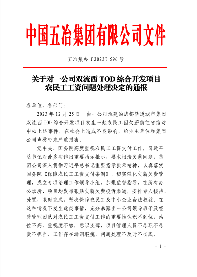 近日,由一公司承建的雙流西TOD綜合開發項目發生一起5名分包工人因欠薪前往省信訪中心上訪事件,在社會上造成了不良影響,給業主單位和公司聲譽帶來嚴重損害,集團公司高度重視,對相關責任主體嚴厲處罰,充分體現了五冶集團對欠薪欠費的高度重視和對工作不嚴不細、不盡責不擔當的零容忍態度。