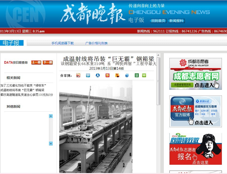昨日,成都晚報記者獲悉:截至3月11日,成溫射線主體工程已完成大半,現已全面進入底層道路、橋面系及防撞墻施工。在2.5環(青羊大道)路口,中國五冶集團有限公司首創了“梁體外設鋼桁架、懸掛施工”的特殊支架施工方式,不占用道路資源,空中澆筑蓋梁,還將吊裝“兩快兩射”工程中最大的鋼箱梁。