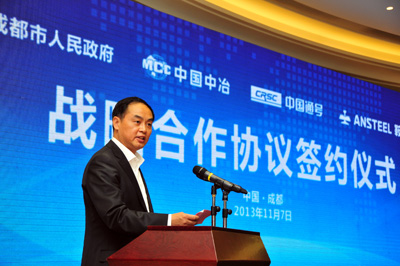 在全體與會人的見證下,中國中冶副總裁王秀峰代表中國中冶與成都市政府簽署了戰略合作框架協議。根據協議,雙方將在建設中冶西部區域中心、中冶天府新區創新科研基地、實施舊城改造、參與城市基礎設施項目等領域開展合作。