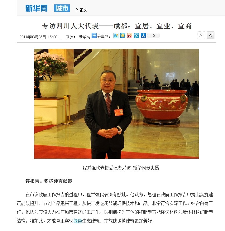 全國兩會期間,3月8日,新華網刊文播發了新華網記者采訪四川代表團的新聞,圍繞“成都:宜居、宜業、宜商”主題,對來自成都的全國人大代表進行了專訪。
