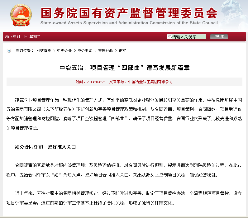 3月25日、26?日,國務院國資委官方網站、中國新聞網分別以“中冶五冶:項目管理‘四部曲’譜寫發展新篇章”和“中國五冶項目管理‘四部曲’確保項目經營質量”為題,對中國五冶集團近年來在項目管理過程中,取得的顯著成績從細分合同評審,把好準入關口;推行項目策劃,模擬實戰演練;實施全面履約,確保經營成果;開展項目后評價,促進管理再提升等四個方面,進行了梳理和報道。