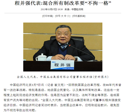 經(jīng)濟日報、中國經(jīng)濟網(wǎng)以“混合所有制改革要‘不拘一格’為題,就如何推動混合所有制改革等問題對程并強進行了專訪。程并強認為,當前國企改革中,應吸取經(jīng)驗教訓,避免因為不規(guī)范導致出現(xiàn)問題。應該從以下幾個方面努力。一是需要多種形式,不能狹隘的理解混合所有制,就是“拿出”國有資產(chǎn),讓民營企業(yè)參與進來。二是需要防止國有資產(chǎn)流失。三是人才選用與薪酬體系,應與市場接軌。