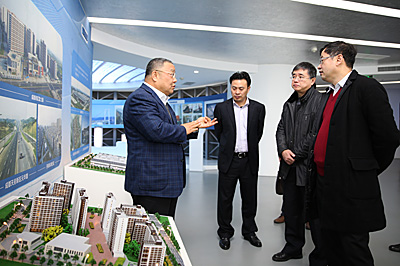 程并強在集團陳列室向李成剛介紹公司綜合優勢