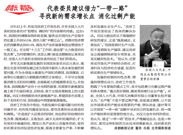 在3月7日《成都晚報(bào)》三版,“奮進(jìn)‘十三五’加快建設(shè)國(guó)際化大都市——2016年全國(guó)兩會(huì)特別報(bào)道”中,記者以“委員代表建議借力‘一帶一路’ 尋找新的需求增長(zhǎng)點(diǎn) 消化過(guò)剩產(chǎn)能”為題,就“十三五”大力推進(jìn)結(jié)構(gòu)性改革話題對(duì)程并強(qiáng)進(jìn)行了專訪。程并強(qiáng)在專訪中指出:加強(qiáng)供給側(cè)結(jié)構(gòu)性改革,增強(qiáng)持續(xù)增長(zhǎng)動(dòng)力,政府工作報(bào)告明確了今年要做的重點(diǎn)工作,其中包括著力化解過(guò)剩產(chǎn)能和降本增效,重點(diǎn)抓好鋼鐵、煤炭等困難行業(yè)去產(chǎn)能?!叭ギa(chǎn)能”不是不要過(guò)剩產(chǎn)能,而是通過(guò)調(diào)整,讓不適應(yīng)市場(chǎng)需求的產(chǎn)能變成需要的產(chǎn)能,例如冶金、建材等可以在國(guó)家“一帶一路”倡議中尋求自己的發(fā)展機(jī)會(huì),把一部分產(chǎn)能轉(zhuǎn)移到更需要的地方去。