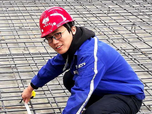 成都鋼構公司浙江豪情汽車項目部員工正在測量鋼筋尺寸