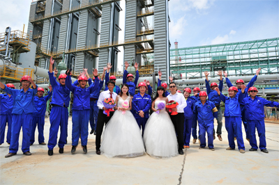 湛鋼工地領(lǐng)導(dǎo)得知這一情況后,決定就在湛鋼工地上為他們舉行一次別樣的婚禮。伴隨著湛鋼煉焦項目機(jī)器設(shè)備的轟鳴聲,湛鋼五冶分指揮部黨工委書記薛志群向兩位新人獻(xiàn)上了鮮花,并送上了深深的祝福,薛書記說道:“你們?yōu)檎夸摴さ氐慕ㄔO(shè)做出了貢獻(xiàn),辛苦了。這次的婚禮有著特殊的意義,希望你們幸福美滿,和和睦睦,白頭到老。也希望你們能早生貴子,像咱們湛鋼工地一樣,早日結(jié)出豐碩的果實(shí)。”隨后,在現(xiàn)場20多位工友的見證祝福下,兩對新人相互擁吻,在大家的歡呼和祝福聲中新人流下了幸福和激動的淚水。